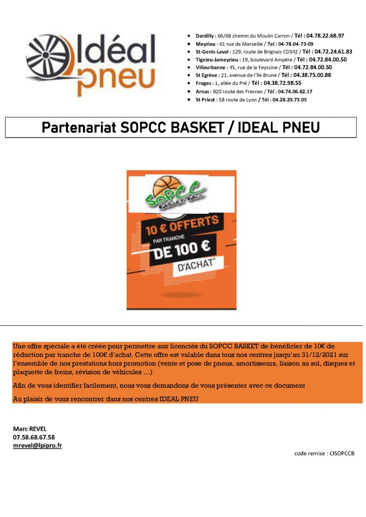 Notre partenaire Ideal Pneu de Tignieu-Jameyzieu vous propose, à vous licenciés ou tout simplement « fans » du club et qui suivez le SOPCC, de vous aider dans cette démarche en ce début d’année. Sur présentation, papier ou numérique, du bon ci-dessous et en venant de la part du SOPCC Basket, vous bénéficierez d’une remise de 10 € par tranche de 100 € d’achat !